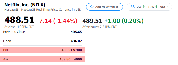 주식 시장이 개인, 기업, 정부 등 투자자가 주식을 매매하는 경매소와 같은 역할을 한다는 것을 알고 계시다면 주식에서 Bid (입찰), Ask (요청)에 관한 이해가 쉬울 수 있습니다. 주식 관련 웹사이트에서 Netflix 주식을 찾아보았습니다. 주가 아래에 나오는 몇 가지 가격 (Bid와 Ask)를 볼 수 있습니다.