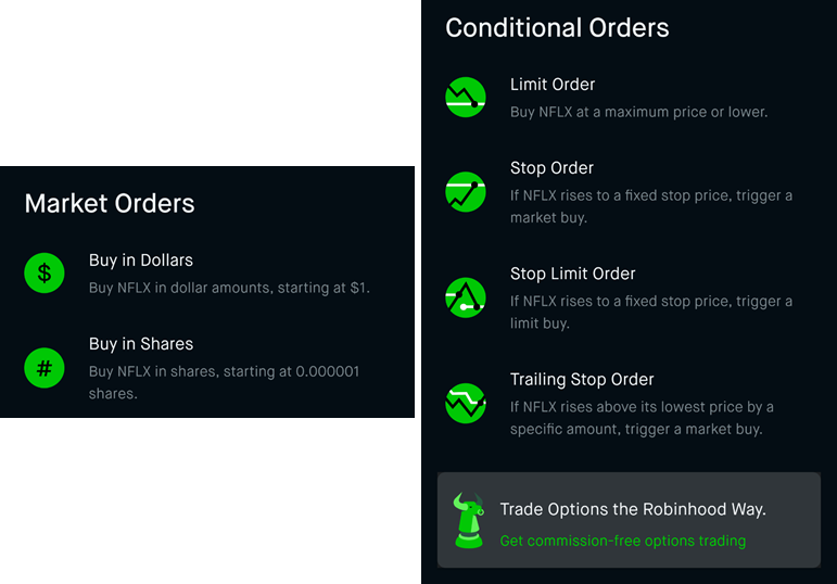 앞에서 나온 로빈후드의 조건 주문의 한 예가 제한 주문입니다. 제한 주문은 현재 가격보다 더 낮은 가격으로 주식을 구매하는 방법으로 사용됩니다. 예를 들어, 주가가 10.05달러 일 때 주식 100 주에 대한 제한 주문을 설정하면 주가가 최소한 10달러보다 낮아지기 전까지는 구매가 이루어지지 않습니다.