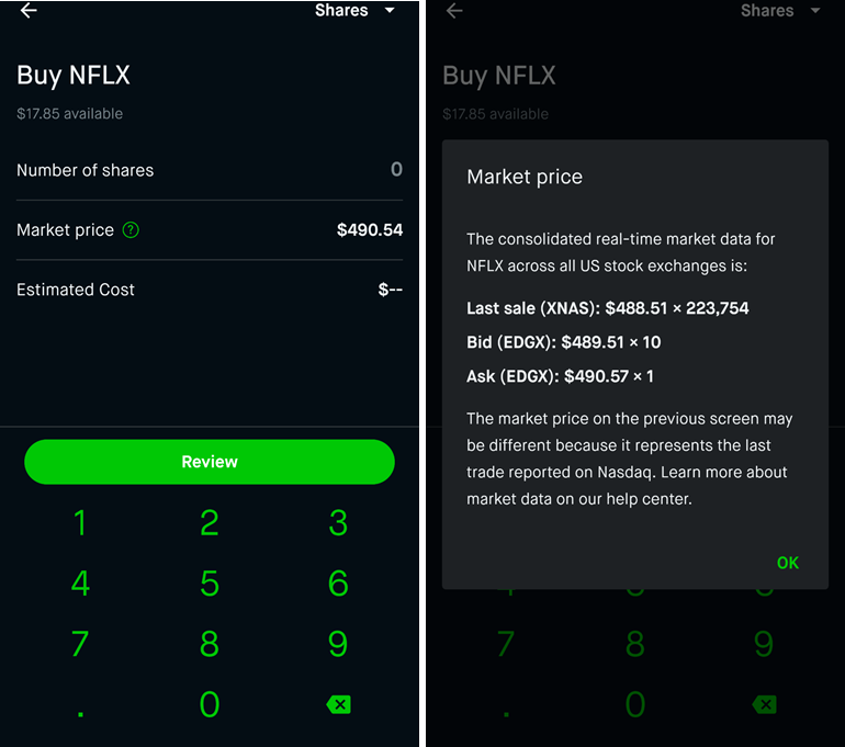 “The price displayed in the app is the last sale price, and might not be the best available price when the order is executed.” 앱에 표시되는 가격은 마지막 판매 가격이며, 주문이 실행되었을 때의 가능한 베스트 가격이 아닐 수 있습니다.