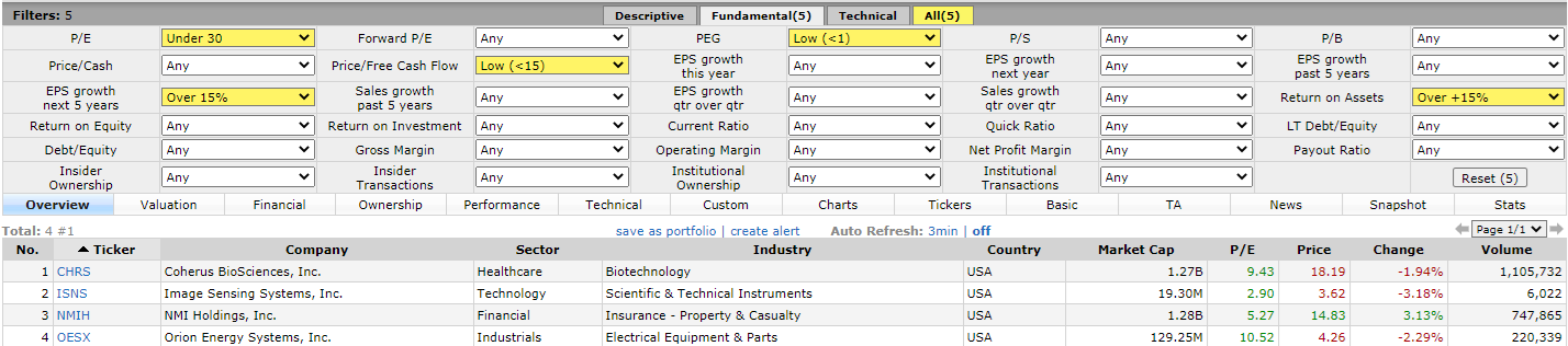 사용한 변수는 P/E ratio가 30 이하, PEG (주가 수익 성장 비율)가 1 이하, Price/Free Cash Flow가 15 이하, EPS growth next 5 years가 15% 이상, Return on Assets이 15% 이상을 사용하였습니다. 검색 결과는 CHRS, ISNS, NMIH, OESX의 4개 회사를 찾을 수 있었습니다.