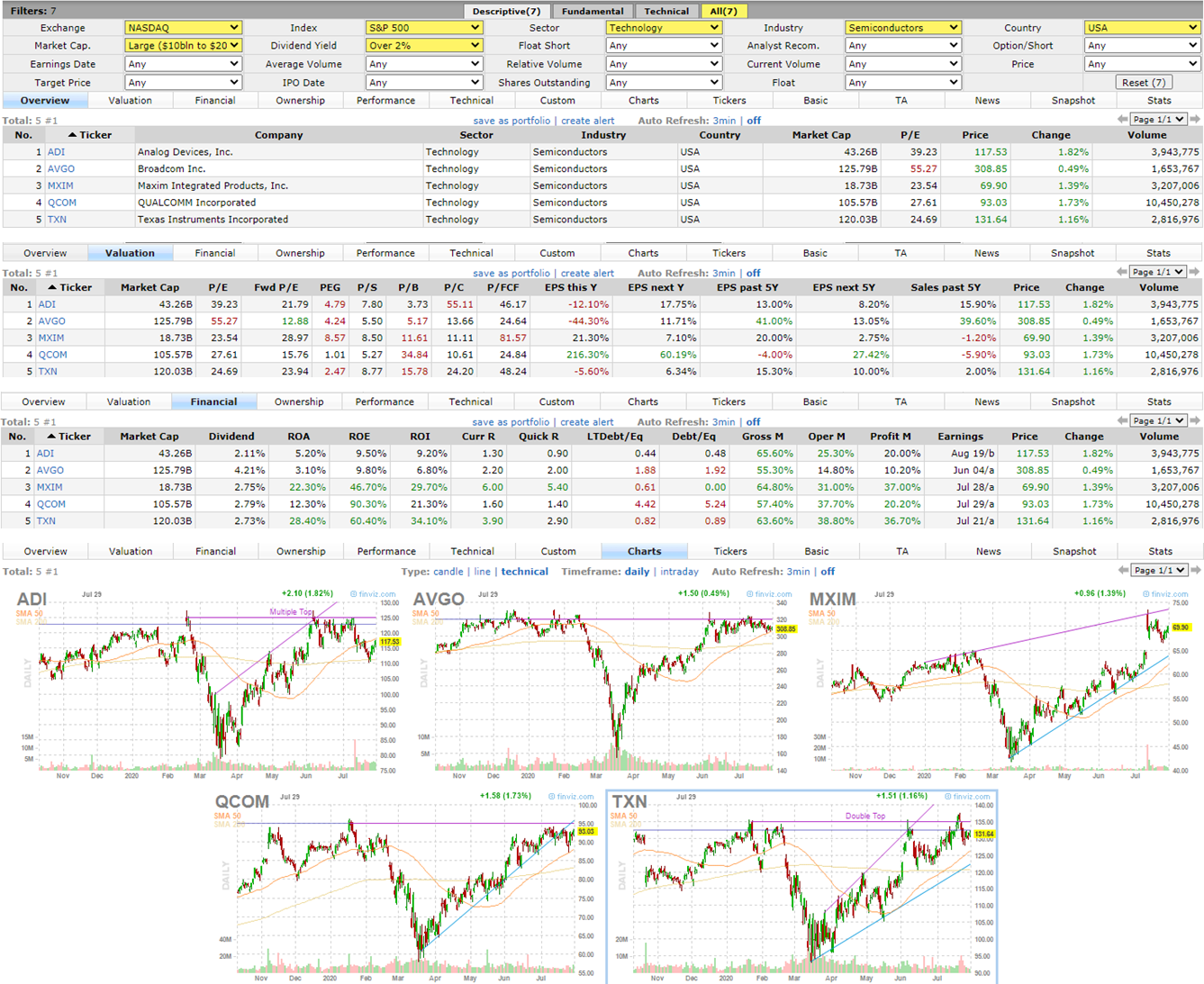 기술적 (Descriptive) 분석, 주식 거래소는 NASDAQ, Index는 S&P 500, Sector는 Technology, Industry는 Semiconductors, Country는 USA, Market Cap. 은 Large ($10 b to $200 b), Dividend Yield는 Over 2%로 필터링했을 때, ADI, AVGO, MXIM, QCOM, TXN 5개 회사를 찾을 수 있었습니다.
