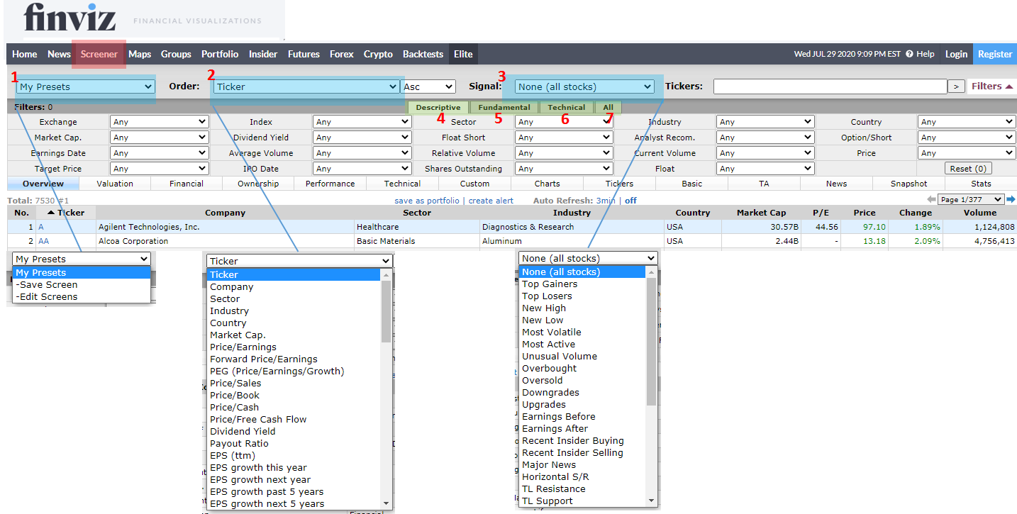 4번 항목을 보면 Exchange, Index, Sector, Industry, Country, Market Cap. Dividend Yield, Float Short, Analyst Recom., Option/Short, Earning Date, Average Volume, Relative Volume, Current Volume, Price, Target Price, IPO Date, Shares Outstanding, Float의 변수가 있습니다. 이는 기술적 (Descriptive) 분석에 관련된 변수를 설정해주는 것입니다.