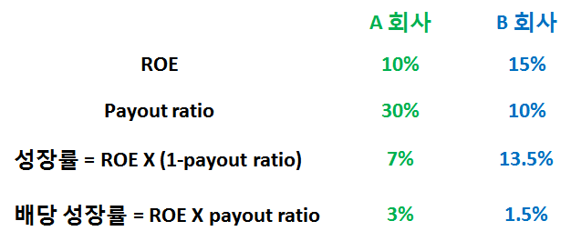 A라는 회사의 ROE가 10%이고 배당 분배율이 30%이라면 배당 성장률은 3% (ROE X payout ratio = 10% X 30%)입니다. B라는 회사의 ROE가 15%이고 배당 분배율이 10%이면 배당 성장률은 1.5% (ROE X payout ratio = 15% X 10%)입니다.