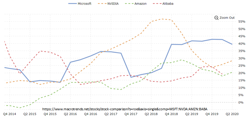 다음은 요즘 핫한 분야인 Cloud computing 관련 회사들의 ROE를 비교한 그래프입니다. Microsoft, Nvidia, Amazon, Alibaba의 4개 회사를 비교해 보았습니다. Microsoft의 ROE는 대략 40%에 가까우며 경쟁사들 (Nvidia ROE 대략 28% 정도, Amazon ROE 대략 20%, Alibaba ROE 대략 20%)에 비해 높은 것을 볼 수 있습니다.