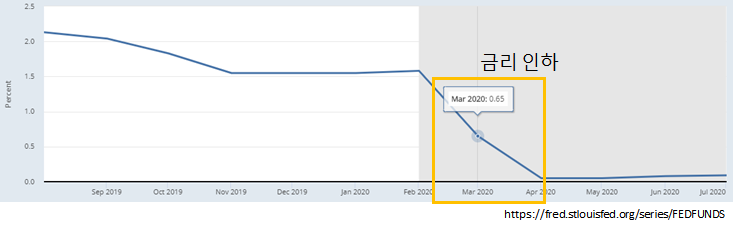 참고로 지난해부터 지금까지의 S&P 500 그래프를 확인해보겠습니다. S&P 500 지수는 2월 19일 사상 최고치를 기록한 후 펜더믹으로 인해 약 한 달 동안 급락을 했었습니다. 주가 하락에 대응하기 위해 3월에 두 차례 기준 금리를 인하하였으며, 금융 위기 이후 처음으로 금리를 0으로 낮추었습니다. 팬데믹에 의한 경제 붕괴를 막기 위해 7000억 달러 규모의 양정 완화 프로그램을 시작했습니다. 또한 연준의 제롬 파월 의장은 경제가 팬데믹을 극복하고 최대 고용 및 물가 안정의 목표를 달성할 수 있다는 확신을 가질 때까지 양적 완화 수준을 유지할 거라고 발표했습니다.