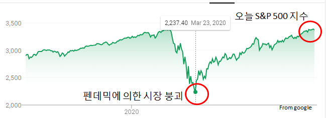 지난 3월 S&P 500 지수가 급락하였지만, 시간이 지남에 따라 차츰 회복을 하고 현재까지 V 자 반등을 보여주고 있습니다.
