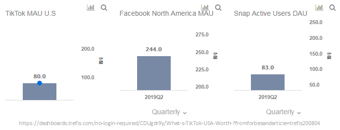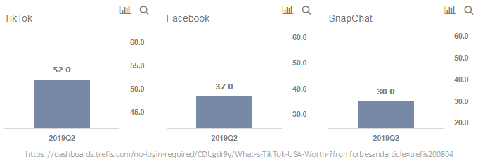 2020년 틱톡의 미국 사업 수익은 약 5 억 달러로 예상하고 약 200 억 달러 (P/S ratio 40배, 5억 달러 X 40 = 200 억 달러)의 가치가 있는 것으로 추정합니다. 이 가치는 페이스북이나 스냅챗보다 훨씬 높습니다 (페이스북 는 21배, 스냅챗은 24배로 평가됨).