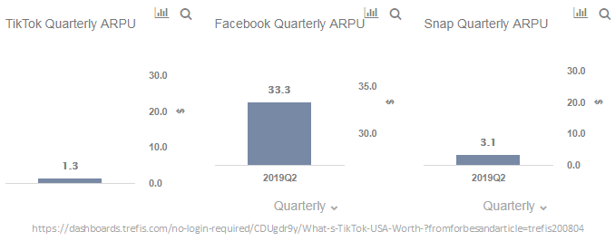 미국 내 틱톡, 페이스북, 스냅챗의 사용자당 평균 수익(Average revenue per user (ARPU)) 비교: 틱톡 미국 분기당 약 1.3 달러, 페이스북 2분기 사용자당 33달러 이상, 스냅챗 사용자당 3달러.