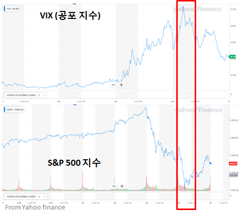 지난주 S&P 500 지수와 VIX 지수를 확인해보았습니다. 역시 VIX 지수가 올라가면서 시장 변동성이 증가하고 그에 따라 S&P 500 지수의 급락이 있었다는 것을 볼 수 있었습니다.