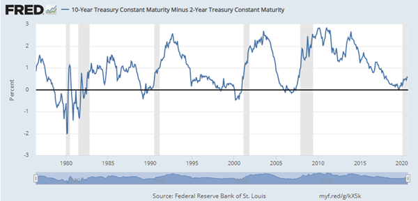 다음은 10년 국채 수익률에서 2년 국채 수익률을 뺀 값을 나타낸 그래프입니다.