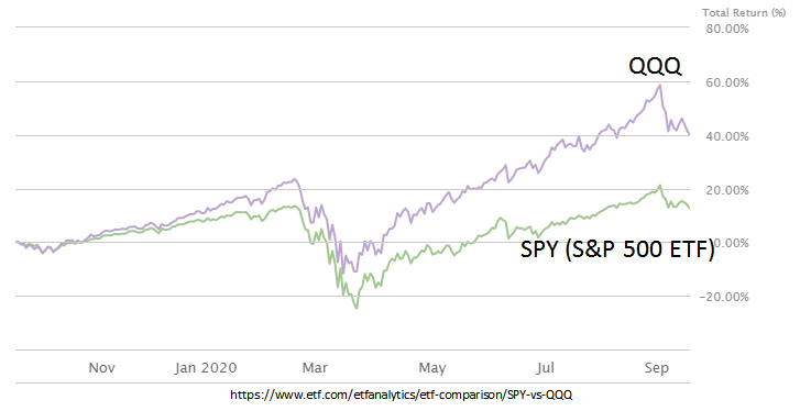 다음은 QQQ와 SPY (S&P 500의 ETF)의 수익 비교 그래프입니다.