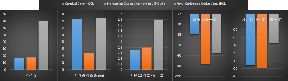 여기서 P/S 비율 (주가 매출 비율, 주가를 주당 매출액으로 나눈 값으로 투자자가 매출 1달러당 지불하는 정도) 비즈니스의 가치를 보여주며 일반적으로 낮은 값이 좋은 의미입니다. Carnival과 Norweigan은 비교적 나쁘지 않은 P/S 비율을 보여주고 있습니다.