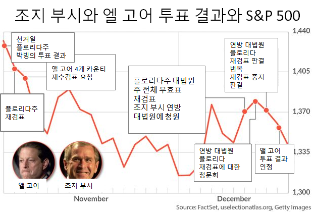2000년 미 대선에서 앨 고어 후보가 플로리다 주에서 재검표를 요청한 이후로 S&P 500은 하락하기 시작하였고 주식 시장은 한 달여간 반복되는 등락을 보여주는 변동성을 보여줬습니다.