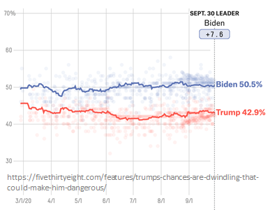 현재 여론 조사를 보면 바이든이 7.6 퍼센트 트럼프를 앞서고 있습니다.