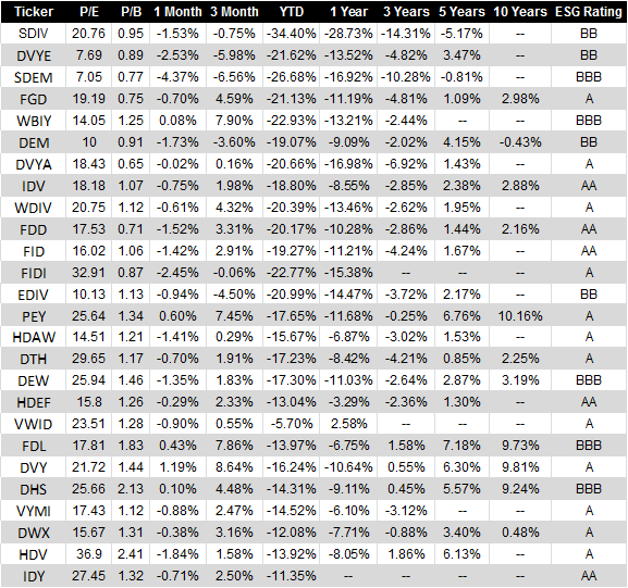 두 번째 표는 첫 번째 표에 나온 ETF의 P/E ratio, P/B ratio, 기간별 수익률, ESG (environmental, social and governance) rating입니다. 기간별 수익률을 보면 아직 팬데믹 전으로 회복하지 않은 ETF들이 많은 것 같습니다.