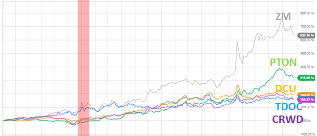 전반적으로 경기가 불안한 상황에서 대부분에 소개된 주식들이 좋은 실적을 보여주고 있었으며, 특히 언컨택 및 재택근무 관련 주식들이 다른 분야보다 더 높은 실적을 보여주었고, Zoom (ZM), Peloton (PTON), L Brands (LB), Etsy (ETSY)는 팬데믹 이후 엄청난 실적을 보여주고 있었습니다.