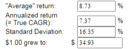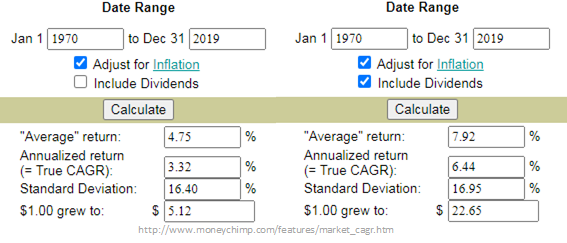 첫 번째 CGAR 계산은 인플레이션과 배당을 제외한 수익률로 1970년부터 2019까지의 평균 수익률을 계산한 것입니다. 1970년에 1달러를 S&P 500에 투자하였다면 지금은 대략 35달러가 되었다는 것을 보여줍니다.