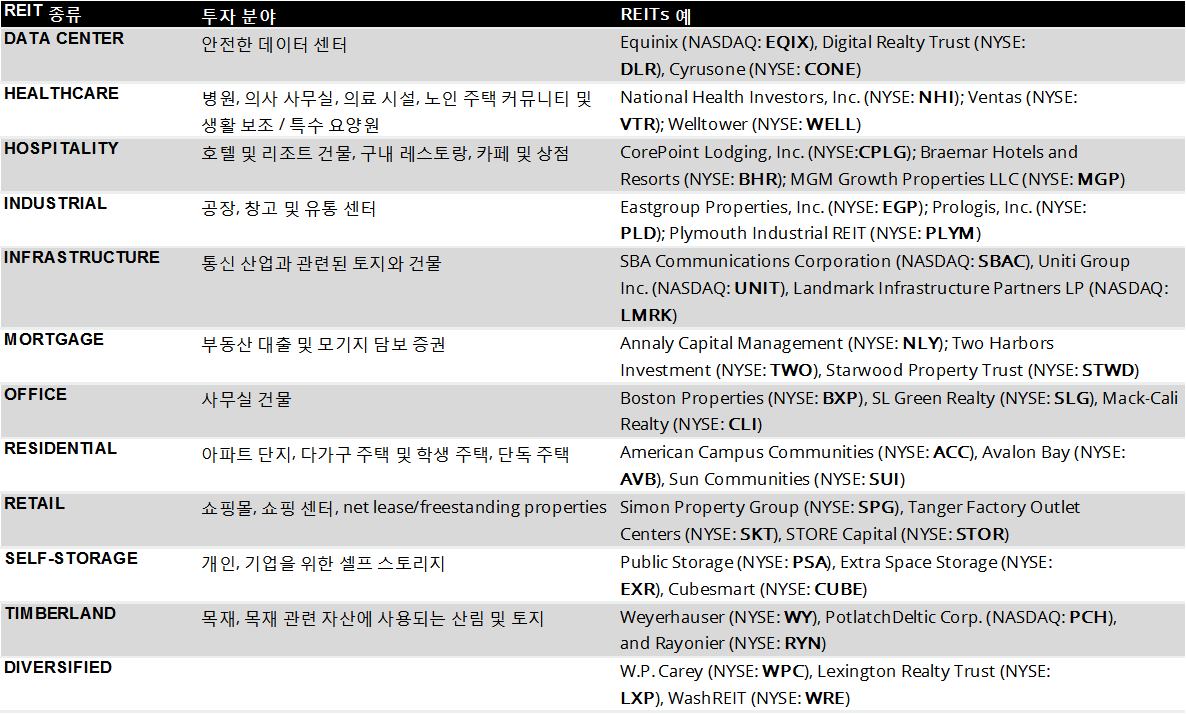지난 포스팅 (REIT 투자)에서 REIT 투자에 대해 대략적으로 알아보았습니다. 오늘은 REIT의 종류와 그 분야의 대표적인 REIT을 알아보겠습니다.