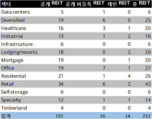 지난 포스팅 (REIT 종류)에 나온 REITs 종류별로 숫자는 다음과 같습니다.