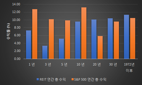 다음은 REITs와 S&P 500의 실적을 기간 별로 비교한 그래프입니다.