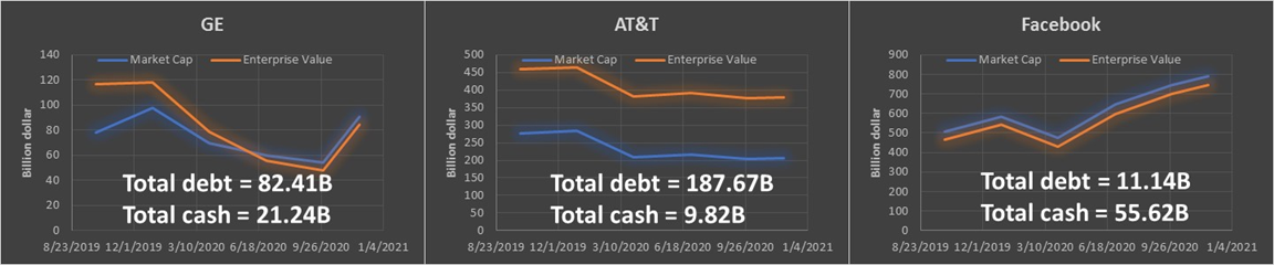 부채가 높으면 기업 가치가 올라가는 것을 고려하면 GE는 현재 과거보다 부채를 줄여서 시가 총액이 기업 가치보다 높습니다. AT&T는 자산이 많음에도 불구하고 부채가 많고 현금이 적어서인지 기업 가치가 시가 총액보다 높습니다. Facebook은 기업가치와 시가 총액이 별 차이가 없다는 것을 볼 수 있습니다.
