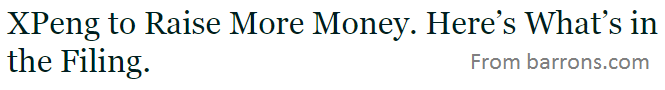 다음은 Barron에서 본 XPeng 주식 뉴스 제목입니다. 대략적인 내용은 중국 전기차 제조사 XPeng은 더 많은 자본을 모으기 위해 2차 공모를 파일링한 후 주가가 하락하였습니다. 회사의 경영진은 일반적으로 주가가 충분히 높다고 느낄 때 2차 공모를 통해 주식을 판매합니다.