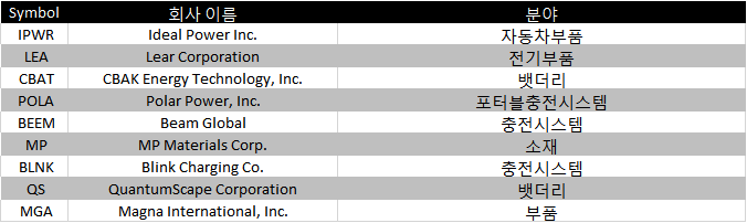 IPWR (Ideal Power Inc.), LEA (Lear Corporation), CBAT (CBAK Energy Technology, Inc.), POLA (Polar Power, Inc.), BEEM (Beam Global), MP (MP Materials Corp.), BLNK (Blink Charging Co.), QS (QuantumScape Corporation), MGA (Magna International, Inc.)