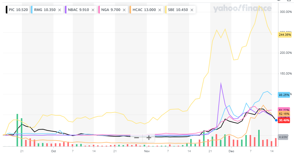 PIC (Pivotal Investment Corporation II), RMG (RMG Acquisition Corp.), NBAC (Newborn Acquisition Corp.), NGA (Northern Genesis Acquisition Corp.), HCAC (Hennessy Capital Acquisition Corp. IV), SBE (Switchback Energy)