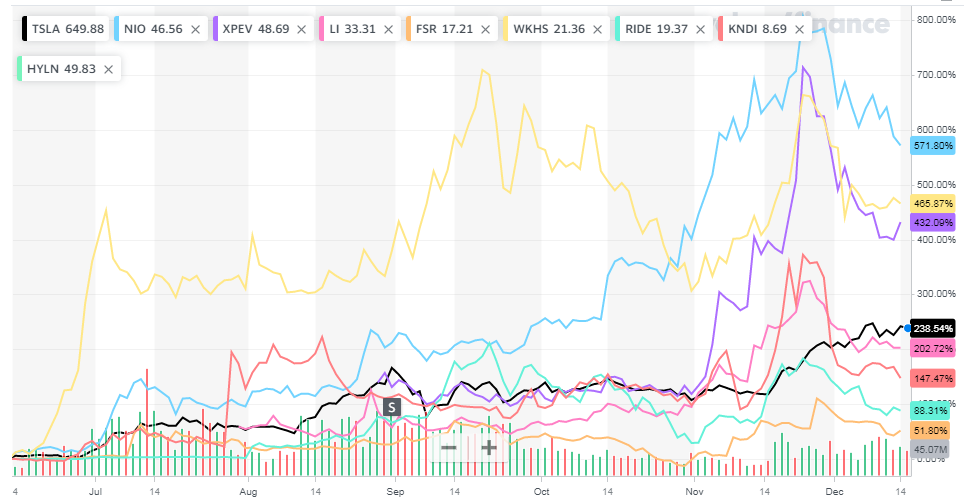 TSLA (Tesla Motors, Inc.), NIO (NIO Inc.), LI (Li Auto Inc.), XPEV (XPeng Inc.), FSR (Fisker Inc.), WKHS (Workhorse Group, Inc.), RIDE (Lordstown Motors Corp.), KNDI (Kandi Technologies Group, Inc.), HYLN (Hyliion Holdings Corp.), NKLA (Nikola Corporation), FUV (Arcimoto, Inc.), AYRO (AYRO, Inc.), SOLO (Electrameccanica Vehicles Corp. Ltd.)