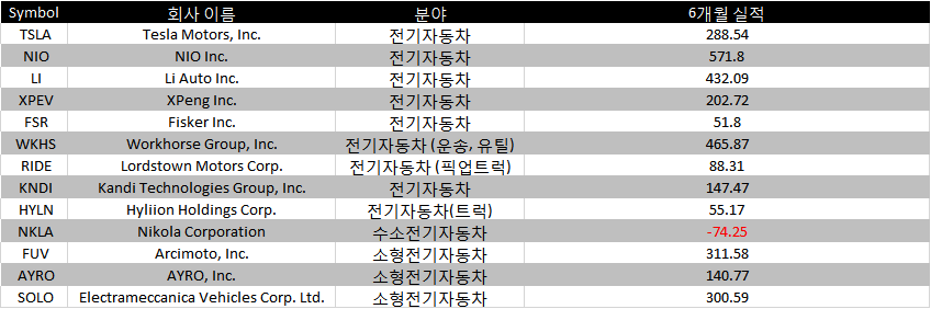 전기 자동차 제조 회사 주식은 대략 13개의 주식을 찾았고 지난 6개월간의 수익률이 평균 230% 정도입니다. 마이너스 수익률 (-74.25%)을 가진 Nikola를 포함했음에도 상당히 높은 수익률을 보여주고 있습니다.