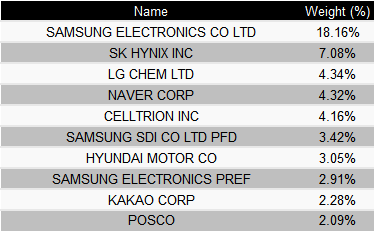 MSCI Korea 25/50 지수를 추적하는 ETF입니다. 펀드는 삼성, 현대, 기아 자동차 등 정보 기술, 소비자 재량, 금융 및 산업 분야에서의 대기업 (108 개 종목)들을 포함하고 있습니다.
