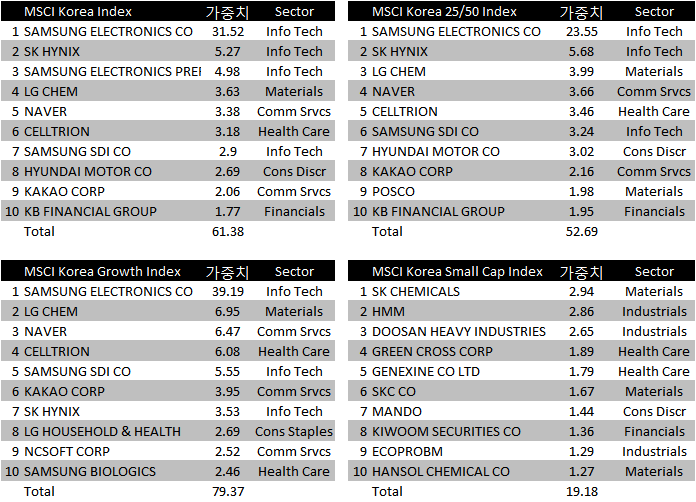 MSCI 한국 성장지수는 한국의 전반적인 성장세를 보여주는 대형 및 중형주를 포함합니다. 더