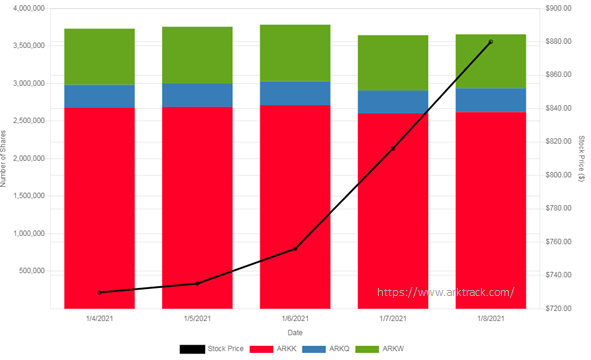 다음 그래프는 2020년 8월부터 지금까지 ARKK의 Tesla 주식 보유수를 보여주고 있습니다. 아주 적극적으로 주식 수가 관리되고 있는 것을 볼 수 있습니다.
