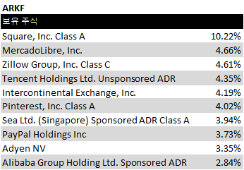모바일 결제, 디지털 지갑, P2P 대출, 블록체인 기술을 포함한 핀테크 섹터의 멀티 캡을 따르며 적극적으로 관리되는 Active ETF입니다. ARKF는 2019년 2월에 운영을 시작한 비교적 새로운 펀드로 국제적인 회사들의 주식을 보유하고 있지만 보유 지분의 67 %가 미국 회사가 차지하고 있습니다. 궁극적으로 비용을 절감하면서 단순성과 접근성을 만들어 금융 서비스에 혁신을 더해주고 있는 핀테크 관련 비즈니스 플랫폼을 가지고 있는 회사들에 중점을 두고 있습니다.