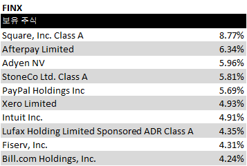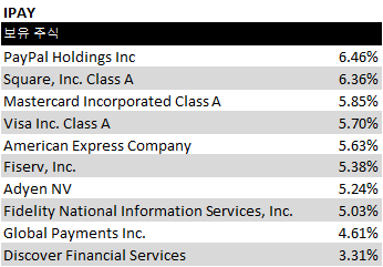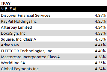 핀테크 중에서 전통적인 부분인 신용 카드 및 현금 거래에서 디지털 및 전자 시스템으로의 전환에 중점을 둔 모바일 결제 산업을 대상으로 하며 신용 카드 회사와 지불 인프라, 지불 서비스, 지불 처리 및 지불 솔루션을 제공하는 회사의 글로벌 주식 지수를 추적하는 유일한 ETF입니다.