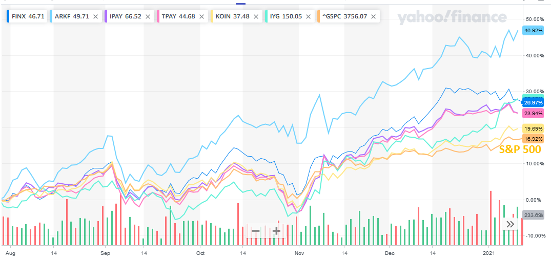 아래 그래프는 핀테크 ETF의 지난 6개월간의 수익률을 보여줍니다. 6개월 동안 최고의 수익률을 보여준 ETF는 ARKF이며 수익률은 46%입니다. 모든 핀테크 ETF는 S&P 500 지수보다는 수익률이 좋은 것을 볼 수 있습니다.