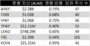 7개 핀테크 ETF의 운용 자산, 운용 비용, 보유 주식 수를 정리한 표입니다. 운용 비용이 일반 ETF보다 높다는 것을 확인할 수 있습니다.