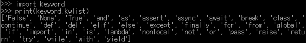 파이썬에 미리 지정된 주요 키워드를 다음 명령어로 확인할 수 있습니다.