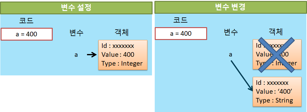 - 변수가 존재하지 않으면 변수를 생성하고 객체를 연결