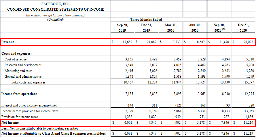 다음은 Facebook의 손익 계산서 (income statement)입니다.
