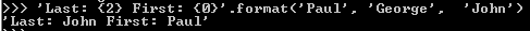 'Last: {2} First: {0}'.format('Paul', 'George', 'John')