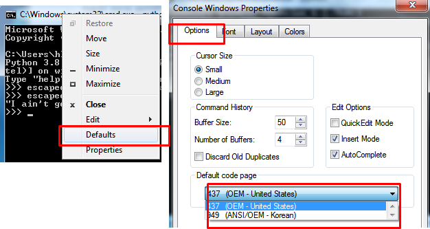 Options에서 Default code page에서 OEM - United States를 설정하면 됩니다. 운영 체제에 따라 설정이 어떻게 바뀌는지는 모르겠습니다.