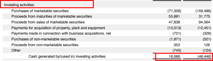 - 유가 증권 (marketable securities) 구매 (purchase), 만기 (maturities) 또는 판매 (sales) 수익금