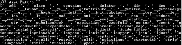 string의 다양한 속성을 보여주고 있습니다. 예, 'capitalize', 'casefold', 'center', 'count' 등