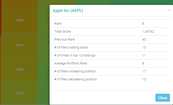 13F 양식에서 150개 펀드의 포트폴리오 데이터를 계산하여 (WhaleScore라는 계산 방식을 사용) 투자 비중이 높은 종목 순위를 정리한 맵입니다. 각 펀드의 포트폴리오에 적어도 5% 이상을 차지한 종목들만 포함한다고 합니다.