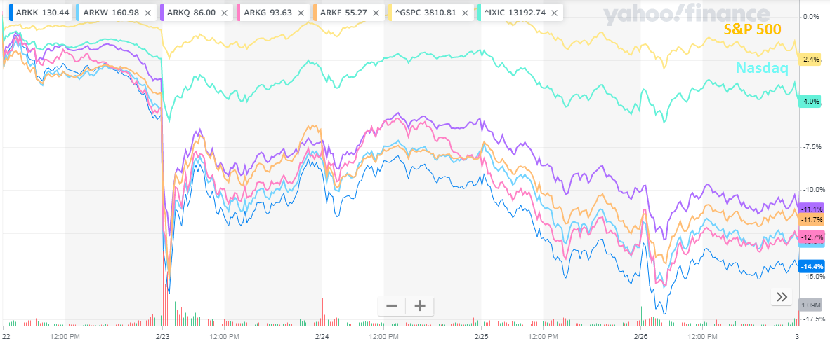 먼저 지난주(2/22-2/26) 폭락장의 상황을 보면 S&P 500과 Nasdaq이 -2.4%, -4.9% 정도 하락하였습니다. 반면에 Ark investment의 주가는 대략 -11 - -14%까지 엄청난 하락을 보여줬습니다.