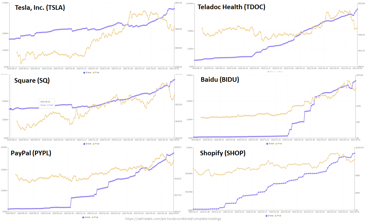 지난주 동안 매수한 종목 중 Ark investment의 가중치가 높은 순위에 있는 몇 개의 종목에 대해 Ark investment에서 보유한 주식 수와 주가 그래프를 살펴보겠습니다.