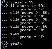 변수 값을 확인하여 90보다 크면 grade가 A, 그렇지 않으면 다음 구문을 확인합니다. 80보다 크면 B, 그렇지 않으면 다음 구문을 확인합니다. 모든 구문을 확인하고 참이 없으면 마지막 else 구문을 확인합니다.