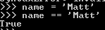 name이라는 변수에 Matt를 지정하고 name이 Matt과 동일한지 확인한 예로 결과 값은 참입니다.
