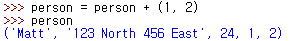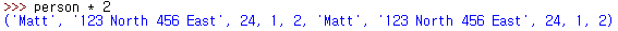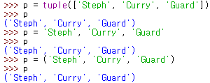 p = tuple(['Steph', 'Curry', 'Guard'])